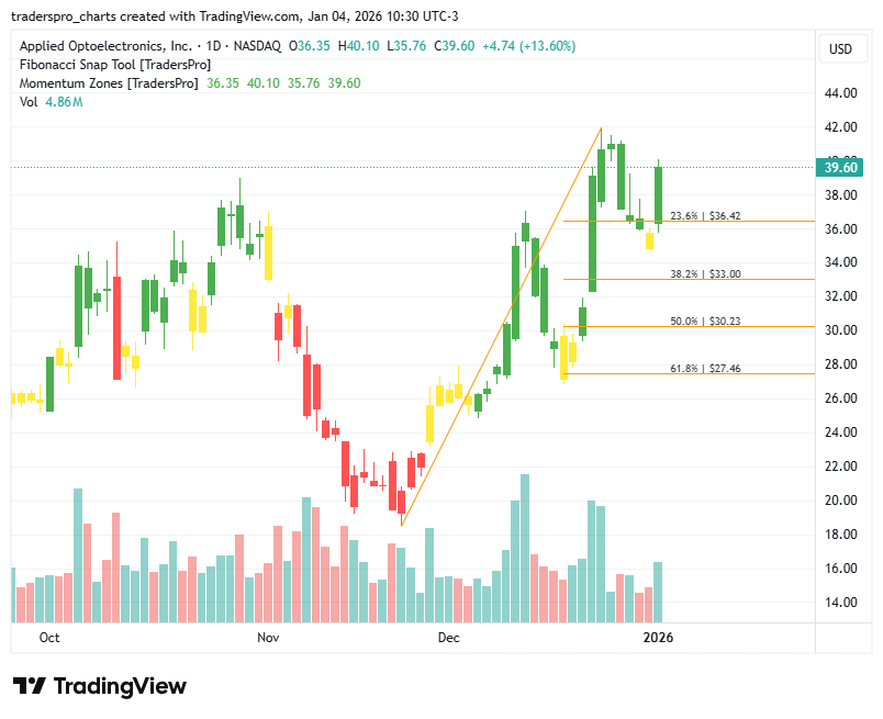 On the chart, AAOI shows a confirmation bar with expanding volume, indicating that buyers are stepping back in as momentum builds. Price has pushed into the momentum zone, which often marks the early stages of a developing trend.