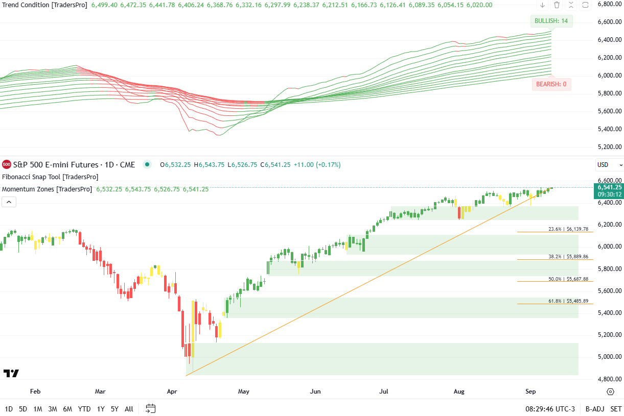 Futures continue to hold a high-level range with a fully bullish trend stack and price perched above the momentum zone.