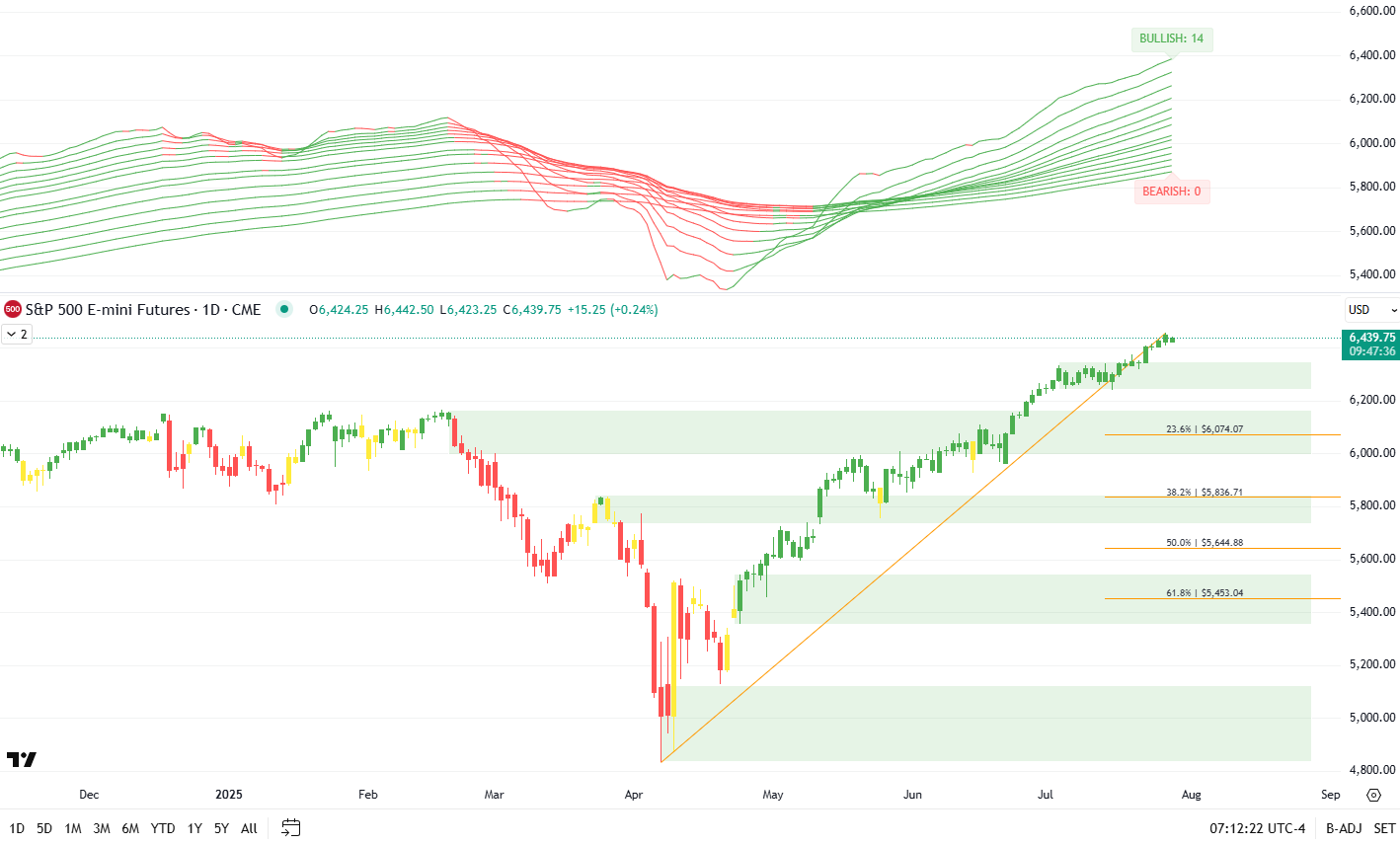 Currently, the S&P 500 Futures are at 6,439.75, up by 15.25 points or +0.24% from the previous session.