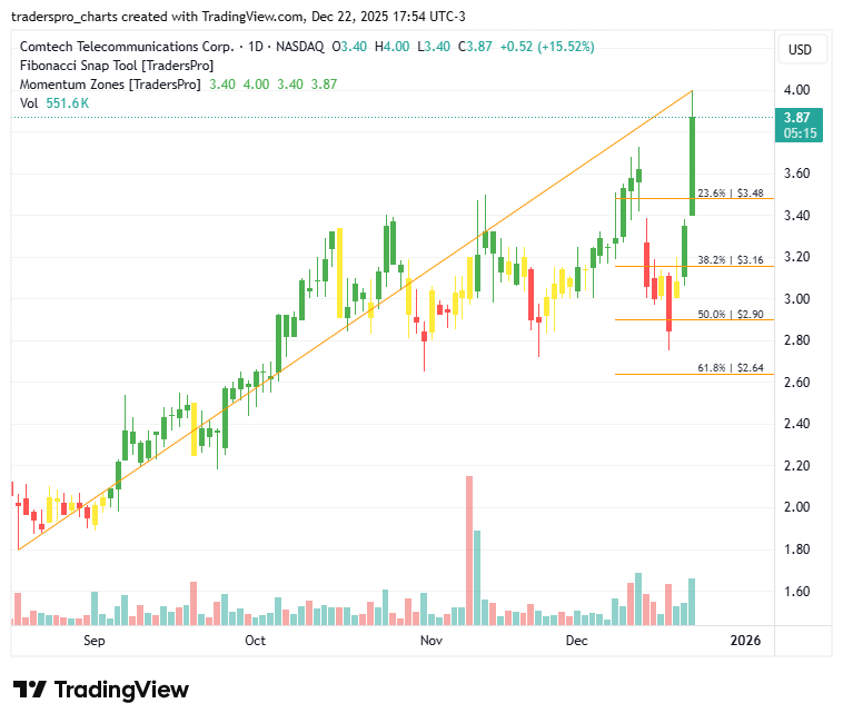On the chart, CMTL shows a confirmation bar backed by increasing volume, which often signals early recognition of improving fundamentals. The move into the momentum zone highlights strengthening trend behavior as price begins to build a more constructive structure.