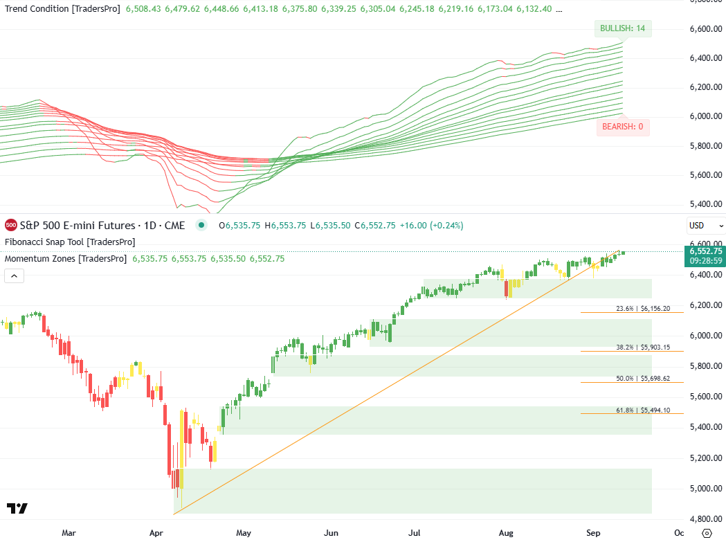 Currently, the S&P 500 Futures are at 6,552.75, up by 16.00 pts or 0.24%.