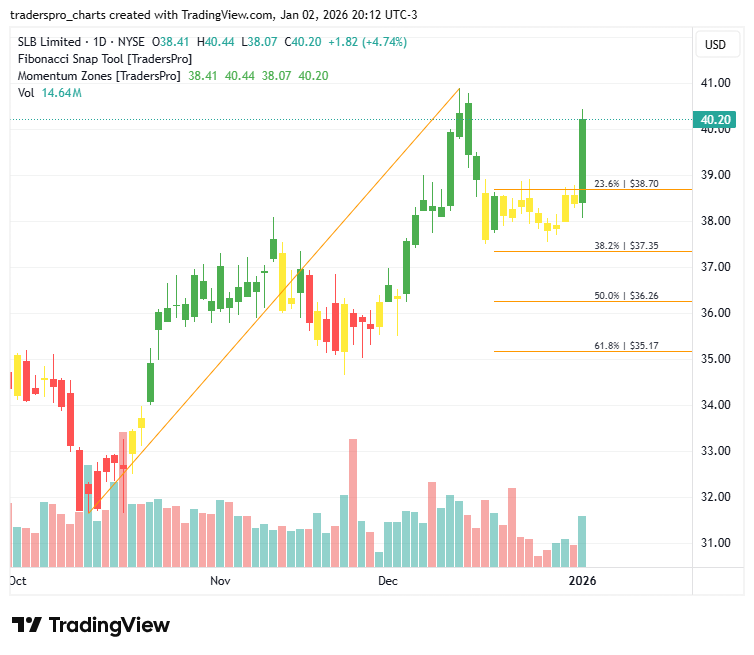 On the chart, SLB shows a clear confirmation bar with expanding volume, suggesting that buyers are stepping back in with conviction. Price has pushed into the momentum zone, which often marks the start of more stable upward movement.