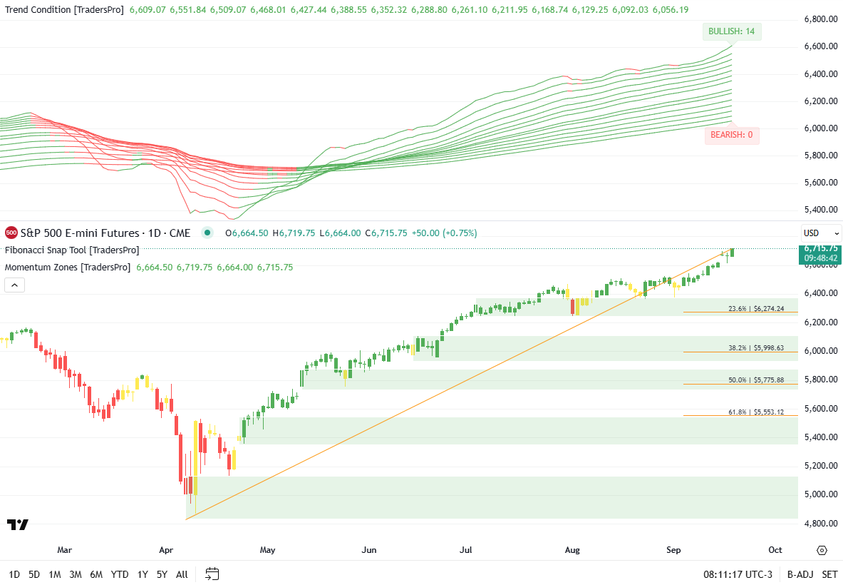 Currently, the S&P 500 Futures are at 6,715.75, up by 50.00 pts or 0.75 %.